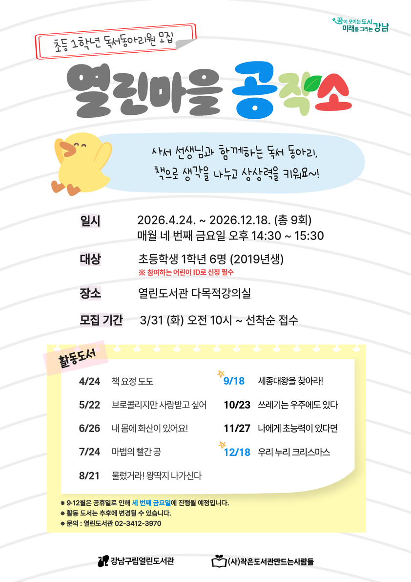 강남구립 열린도서관에 독서 토론 동아리 <열린마을 공작소💡>가 열렸습니다! 다양한 독후활동을 통해 상상력과 창의력을 뿜뿜-✨ 발휘할 초등학교 1학년 학생(2019년생)들을 모집합니다~ "사서 선생님과 재밌게 책 읽을 어린이 🐤🐤..🐤..💕 모여라!" 📖 9, 12월 수업은 공휴일로 인해 세 번째 금요일에 진행될 예정입니다. 📖 꾸준하게 참여할 수 있는 어린이만 신청해주세요. 📖 무단결석 시 참여가 제한됩니다. ![]() |