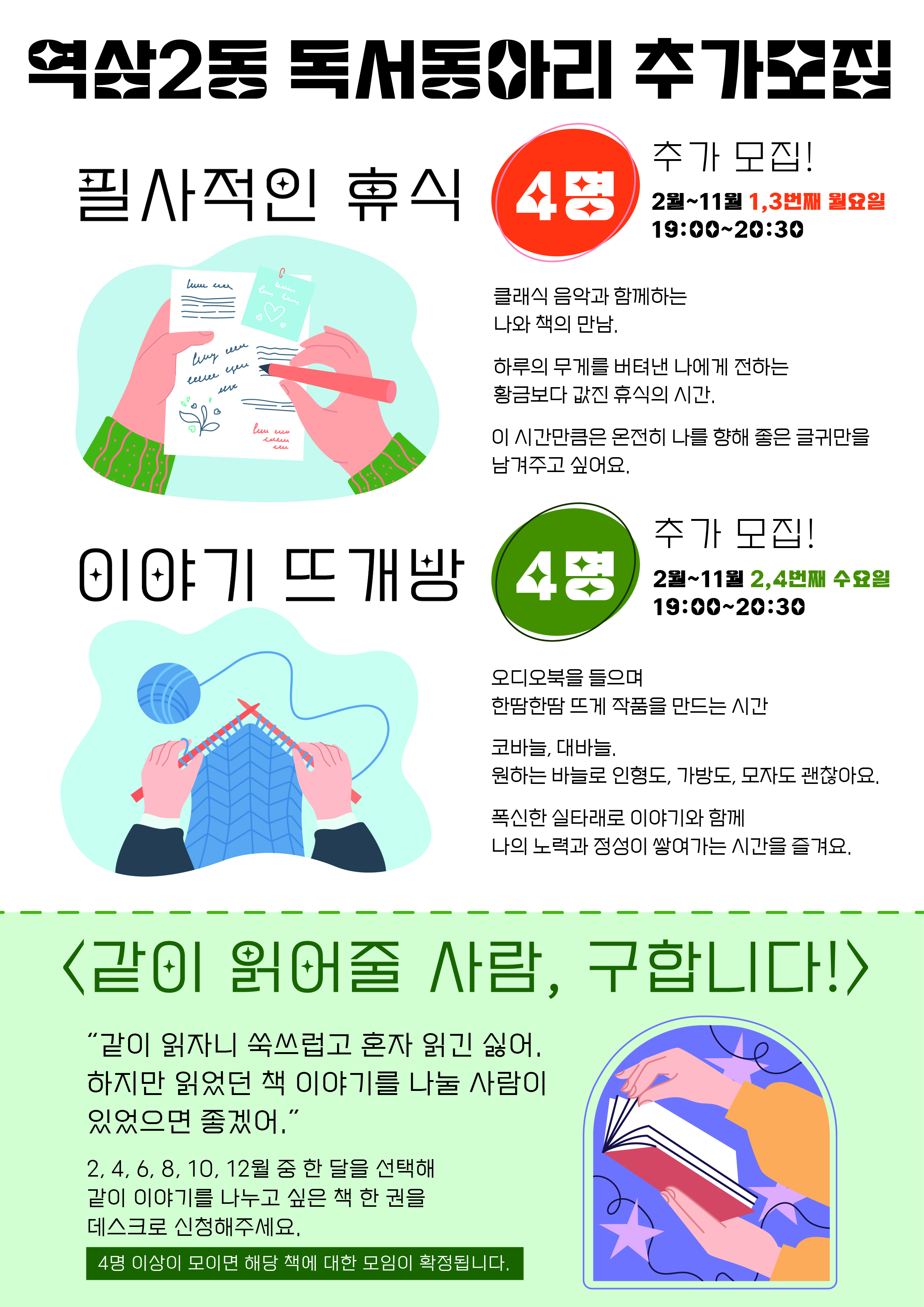 *현재 페이지는 이야기 뜨개방 독서동아리 모집공고 입니다. *1회성 독서모임인 '같이 읽어줄 사람 구합니다'에 참여하실 분은 데스크로 별도 문의 바랍니다 (도서관: 02-567-0930)